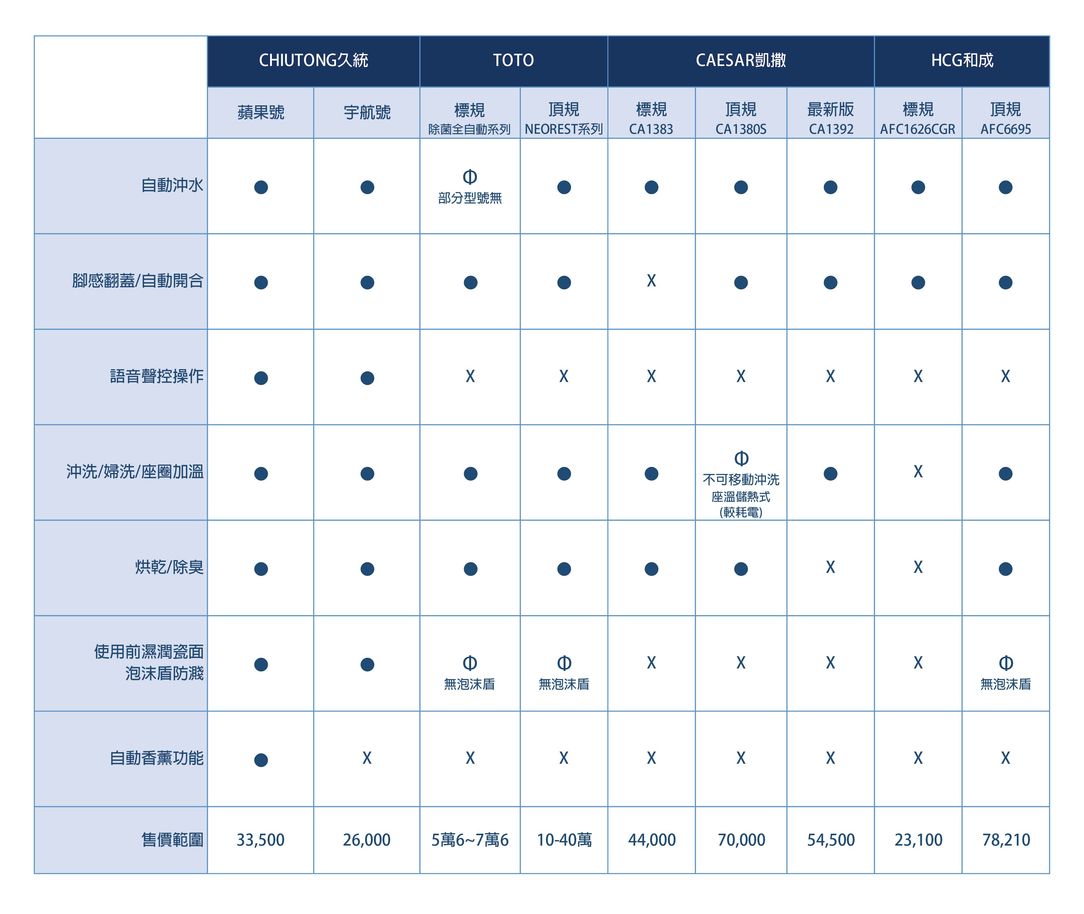 為了讓大家更清楚了解智能馬桶的實際差異,我們整理了市面上三大品牌的標規與頂規型號,與久統自家的「蘋果號」與「宇航號」一同列入比較。從功能配置到價格定位,幫你一次掌握市場全貌。