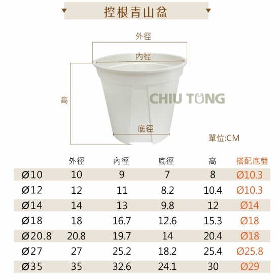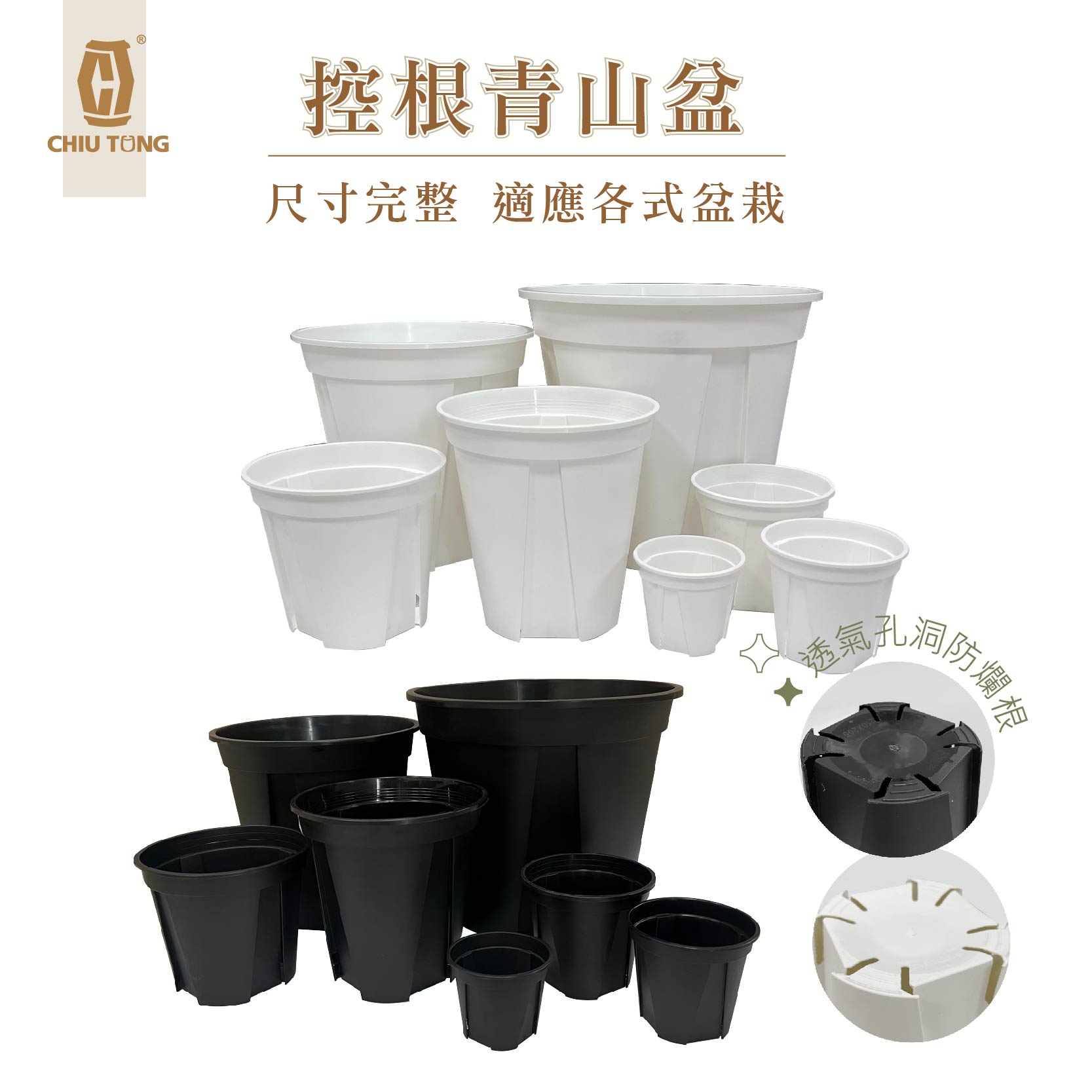控制水分排放和增加通氣性,提供一個有利於植物生根的環境。盆側孔設計,利用空氣斷根原理,讓根系不盤根,促進鬚根增生,讓養份、水份的吸收更快速,有助於快速生長,提升移植成功率、降低爛根機率,延長植物換盆時間。