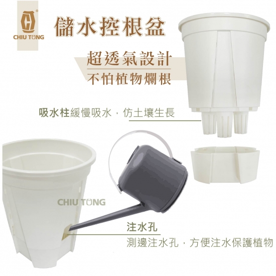 控制水分排放和增加通氣性,提供一個有利於植物生根的環境。盆側孔設計,利用空氣斷根原理,讓根系不盤根,促進鬚根增生,讓養份、水份的吸收更快速,有助於快速生長,提升移植成功率、降低爛根機率,延長植物換盆時間。
