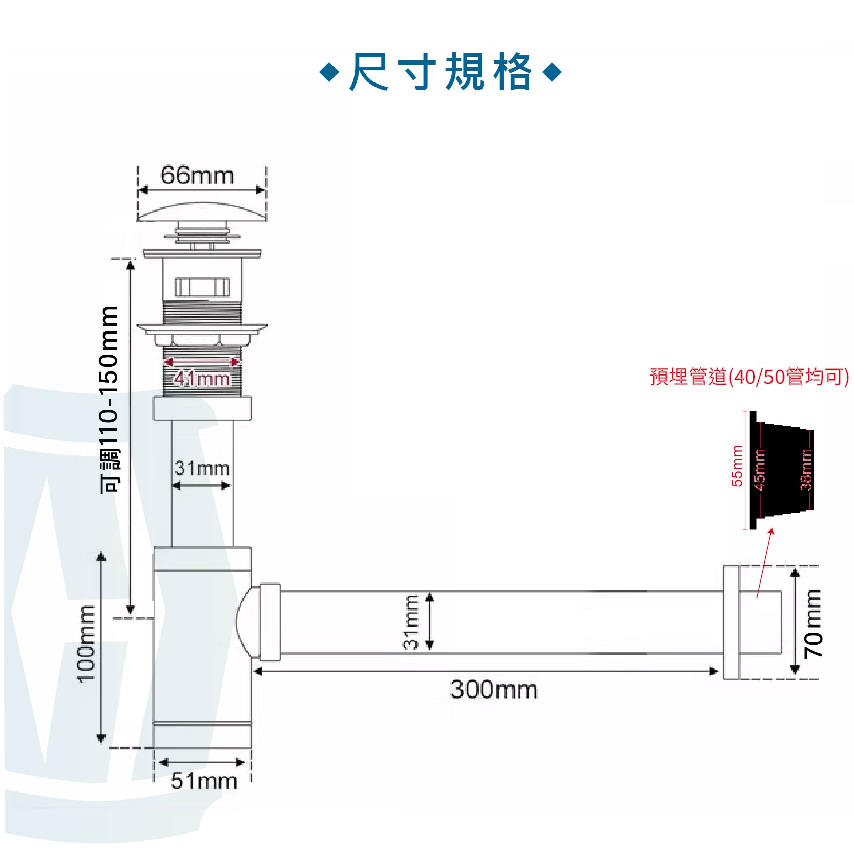 尺寸規格:排管長度 300mm,口徑 Ø40/50mm 可選,安裝簡單。
