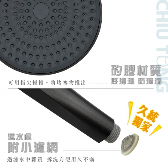 材質:ABS塑膠電鍍+矽膠(出水孔)