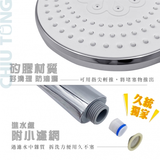 材質:ABS塑膠電鍍+矽膠(出水孔)