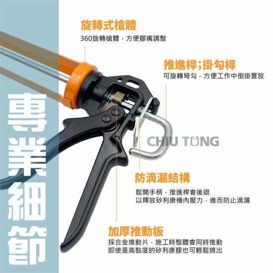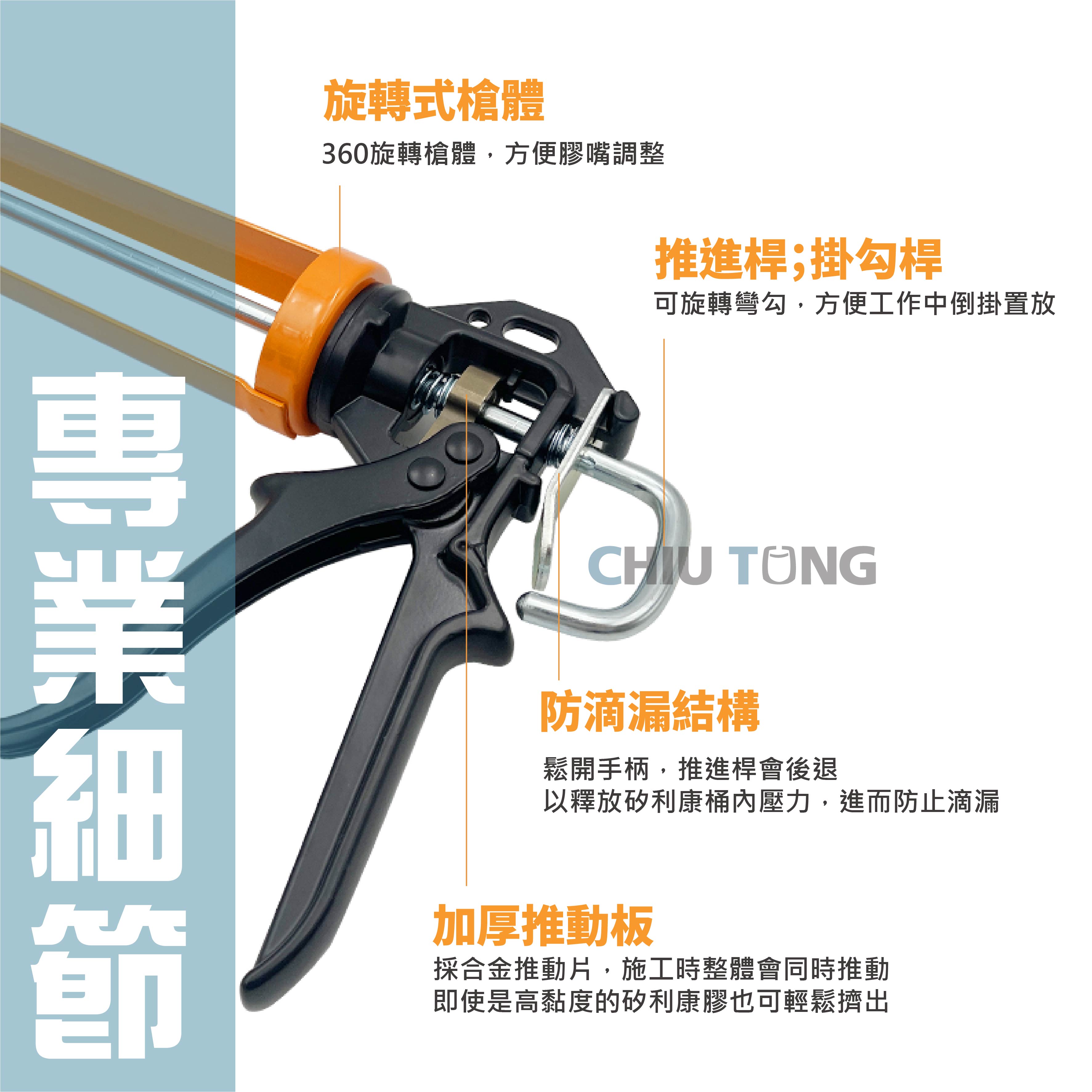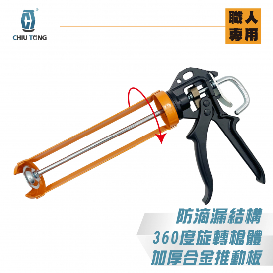 旋轉式矽利康槍是一種專門設計用於施加矽利康的工具,適合各類建築、裝修及手工藝工作。它的旋轉噴嘴設計使得施工更加靈活,特別是在狹小或難以觸及的地方。