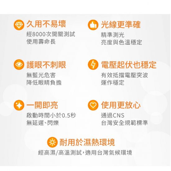 居家室內專用LED燈泡,一顆可抵3顆以上省電燈泡,通過台灣CNS品質認證安全更有保障,無藍光危害搭配均光、低眩光設計,保護你的靈魂之窗,點亮家中每個角落。