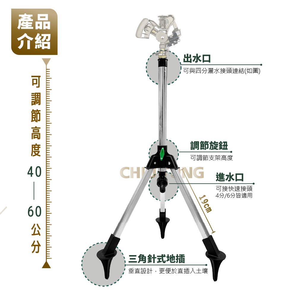 灑水器專用三腳架結合便利性和功能性,提供40-60公分的高度調節,可以根據不同作物的需求調整適當的灑水高度。下方的三角插針能更好的固定位置,不受戶外風力影響,台灣製造和尺寸通用性,使其成為園藝愛好者的理想選擇。